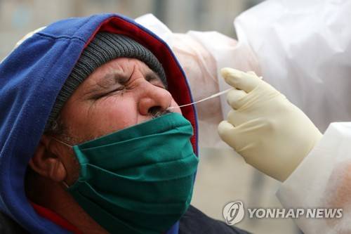 epa08926366 A medical worker takes a swab from a patient at a coronavirus swab test location in Tunis, Tunisia on 08 January 2021. The municipality of Tunis is launching, in cooperation with the regional health directorate of Tunis, a screening campaign for the coronavirus. EPA/MOHAMED MESSARA