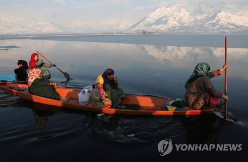 epa08926402 Kashmiri women row a boat on frozen ice layer waters of Nageen Lake on a sunny day in Srinagar, the summer capital of Indian Kashmir, 08 January 2021.The weather has improved in Indian Kashmir after recent heavy snowfall. The region?s air connectivity has been restored and efforts are on to restore road connectivity also. EPA/FAROOQ KHAN