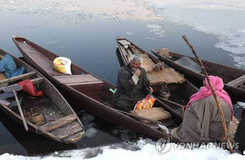 epa08926401 A Kashmiri man smokes from hubble bubble as he sits inside a small boat on the waters on the waters of Nageen Lake on sunny day in Srinagar, the summer capital of Indian Kashmir, 08 January 2021.The weather has improved in Indian Kashmir after recent heavy snowfall. The region?s air connectivity has been restored and efforts are on to restore road connectivity also. EPA/FAROOQ KHAN