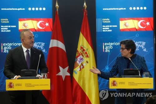 epa08926405 Turkish Foreign Minister Mevlut Cavusoglu (L) and his Spanish counterpart Arancha Gonzalez Laya (R) address a press conference after their meeting in Madrid, Spain, 08 January 2021. EPA/J.J. Guillen