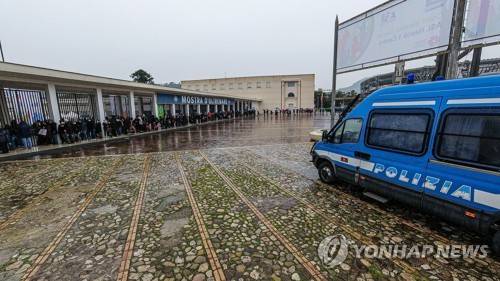 epa08926406 A police van next to a long line of people standing in rainy weather to receive a vaccination against Covid-19 in Naples, 08 January 2021. EPA/CESARE ABBATE