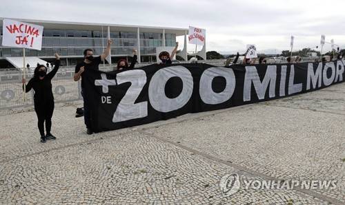 Protesters shout slogans "Vaccine now" and hold the Portuguese message "Over 200,000 deaths. It's your fault, Bolsonaro," referring to Brazilian President Jair Bolsonaro and the COVID-29 pandemic, outside the presidential palace in Brasilia, Brazil, Friday, Jan. 8, 2021, the day after Brazil passed 200,000 pandemic deaths. (AP Photo/Eraldo Peres)