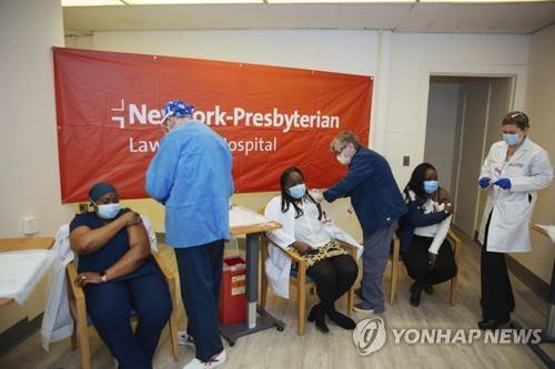 Doctors inject sisters Claudia Scott-Mighty, left, Althea Scott-Bonaparte, who are patient care directors, and Christine Scott, an ICU nurse, with their second shot of the Pfizer vaccine at NewYork-Presbyterian Lawrence Hospital on Friday, Jan. 8, 2021, in Bronxville, N.Y. The second round of the vaccine increases its efficacy to 95%, according to Pfizer. (AP Photo/Kevin Hagen).
