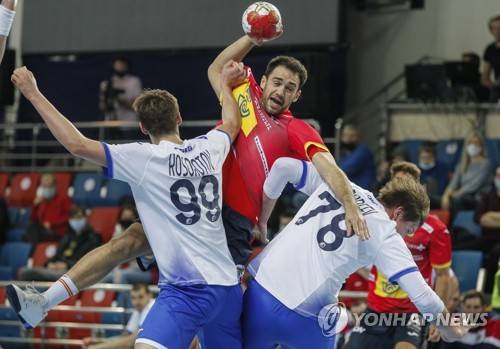epa08926447 Ian Tarrafeta Serrano (C) of Spain in action with Sergei Kosorotov (L) and Pavel Andreev (R) of Russia during the Christmas Tournament handball match between Russia and Spain in Moscow, Russia, 08 January 2021. EPA/SERGEI ILNITSKY