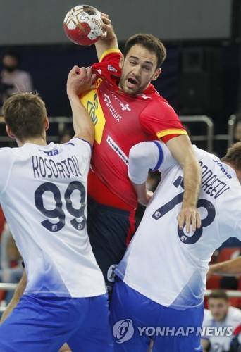 epa08926461 Ian Tarrafeta Serrano (C) of Spain in action with Sergei Kosorotov (L) and Pavel Andreev (R) of Russia during the Christmas Tournament handball match between Russia and Spain in Moscow, Russia, 08 January 2021. EPA/SERGEI ILNITSKY