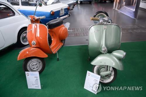 epa08926500 A Vespa 50 L (L) and Vespa Faro Basso scooters on display at the Automobile Museum of the Automobile Club of Wielkopolska in one of the oldest buildings of the Pozna International Fair (MTP) - Pavilion No. 2, in Poznan, Poland, 08 January 2021. The exhibition includes 83 cars, a dozen motorcycles, ten trailers, bicycles and a bus. EPA/Jakub Kaczmarczyk POLAND OUT
