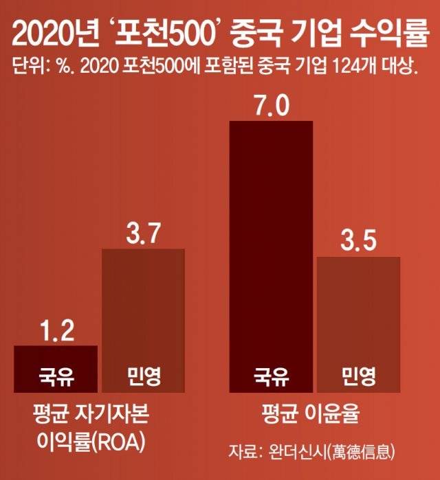 문제는 국유기업의 부실이 상당하다는 데 있다. 2019년 국유기업은 총 1조5000억 위안(약 257조 원)의 순이익을 올렸지만 이익률이 0.7%에 불과했다. 국영 철강사 바오우(寶武)는 지난해 영업이익이 한 해 전보다 42%나 줄었는데도 공산당으로부터 “가난한 이를 위한 기금을 마련하라”는 지시를 받았다. 빈곤 해소는 입버릇처럼 ‘샤오캉(小康·모든 국민이 풍족한 사회)’을 언급하는 시 주석의 최우선 과제다. 이윤 추구보다 권력자의 정책 목표를 더 중요하게 여기는 기업이 피 튀는 경쟁에서 살아남을 리 만무하다.