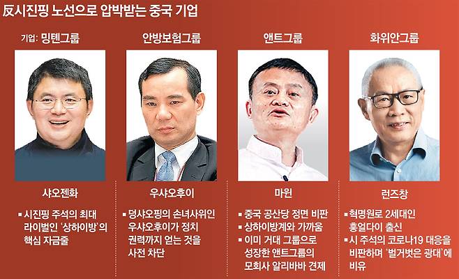 이번 사태가 단순히 특정 기업인에 대한 손보기 수준을 넘어섰다는 평가도 나온다. 2012년 집권한 시진핑(習近平) 국가주석이 장쩌민(江澤民) 전 주석이 이끄는 상하이방, 공산혁명 원로의 후손을 뜻하는 태자당을 정적으로 인식하면서 두 세력과 가까운 기업을 압박하고 있다는 의미다.