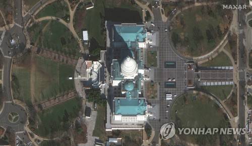 epa08926861 A handout satellite photo dated 07 January 2021 and made available by Maxar 08 January 2021 shows a partial view of Washington D.C., including the U.S. Capitol and surrounding area with a view of the inauguration stands and seats along the west side of the Capitol as well as an overview of the Capitol grounds. The inauguration of president-elect Joe Biden as President of the United States will take place on 20 January 2021. EPA/MAXAR HANDOUT THE MAXAR LOGO MAY NOT BE REMOVED, CROPPED. HANDOUT EDITORIAL USE ONLY/NO SALES