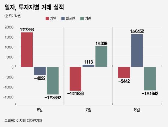 코스피가 3000선에 진입한 6일 이후 투자주체별로 번갈아 증시를 이끌고 있다. 6일 개인 1조7293억원 순매수에 이어, 종가 기준 3000선에 안착한 7일에는 기관이 1조339억원 사들였다. 배턴을 넘겨받은 외국인이 이날 1조6452억원 순매수하면서 결국 3100포인트에 올라섰다.