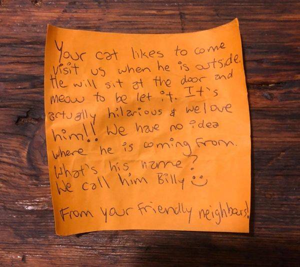시프노바 씨는 혹시나 하는 마음에 "우리 집 고양이가 이웃들과 친구가 된 줄은 몰랐네요. 고양이 이름은 '빌리'이고, 턱을 긁어주는 걸 좋아한답니다"라고 답장을 써 고양이 목줄에 끼워뒀습니다.