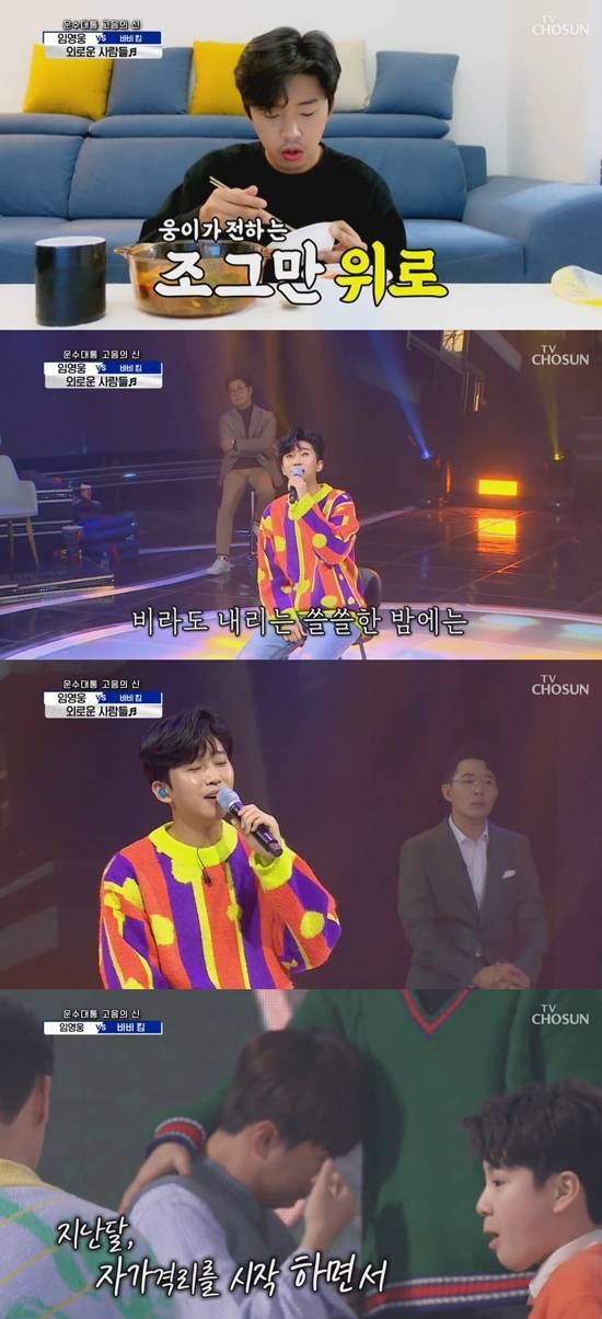 자가격리 당시 느꼈던 외로움을 담은 곡으로 무대에 선 임영웅은 진정성 있는 가사가 인상적인 곡을 자신만의 감성으로 재해석해 열창했다. 진심을 담은 '외로운 사람들' 무대는 96점을 받으며 승부를 원점으로 돌려놨다.