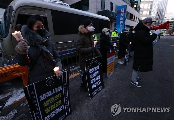 (서울=연합뉴스) 홍해인 기자 = 사단법인 대한피트니스경영자협회와 헬스클럽관장연합회 회원들이 9일 오후 서울 영등포구 여의도 더불어민주당사 앞에서 신종 코로나바이러스 감염증(코로나19) 관련 실내체육시설에 대한 형평성 있는 '집합금지' 조치 완화를 촉구하며 촛불 시위를 벌이고 있다. 2021.1.9
