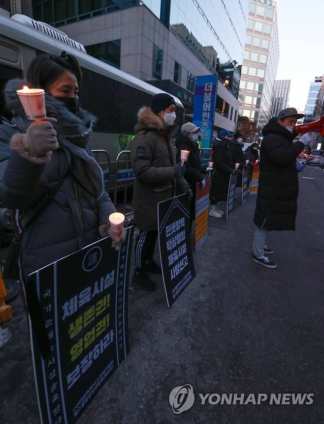 (서울=연합뉴스) 홍해인 기자 = 사단법인 대한피트니스경영자협회와 헬스클럽관장연합회 회원들이 9일 오후 서울 영등포구 여의도 더불어민주당사 앞에서 신종 코로나바이러스 감염증(코로나19) 관련 실내체육시설에 대한 형평성 있는 '집합금지' 조치 완화를 촉구하며 촛불 시위를 벌이고 있다. 2021.1.9