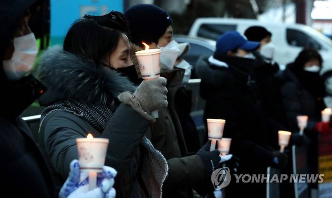 (서울=연합뉴스) 홍해인 기자 = 사단법인 대한피트니스경영자협회와 헬스클럽관장연합회 회원들이 9일 오후 서울 영등포구 여의도 더불어민주당사 앞에서 신종 코로나바이러스 감염증(코로나19) 관련 실내체육시설에 대한 형평성 있는 '집합금지' 조치 완화를 촉구하며 촛불 시위를 벌이고 있다. 2021.1.9
