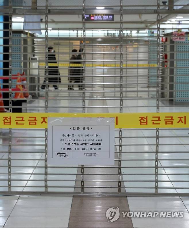 (서울=연합뉴스) 홍해인 기자 = 9일 오후 서울 강남역 지하도상가가 폐쇄돼 있다. 서울시와 서울시설공단은 강남지하도상가관리소 소속 환경미화원 1명이 이날 서초구보건소로부터 신종코로나바이러스감염증(코로나19) 확진 통보를 받으면서 강남역 지하도상가를 10일 밤 12시까지 폐쇄할 계획이다. 지하철 이용자 등의 불편을 최소화하기 위해 별도 이동 통로는 확보된 상태다. 2021.1.9