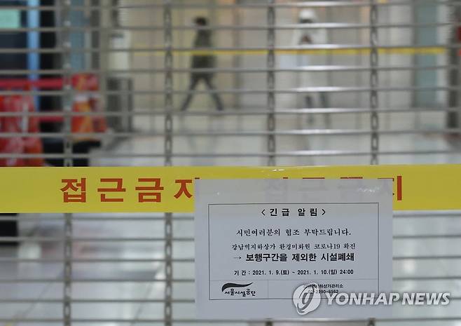 (서울=연합뉴스) 홍해인 기자 = 9일 오후 서울 강남역 지하도상가가 폐쇄돼 있다. 서울시와 서울시설공단은 강남지하도상가관리소 소속 환경미화원 1명이 이날 서초구보건소로부터 신종코로나바이러스감염증(코로나19) 확진 통보를 받으면서 강남역 지하도상가를 10일 밤 12시까지 폐쇄할 계획이다. 지하철 이용자 등의 불편을 최소화하기 위해 별도 이동 통로는 확보된 상태다. 2021.1.9