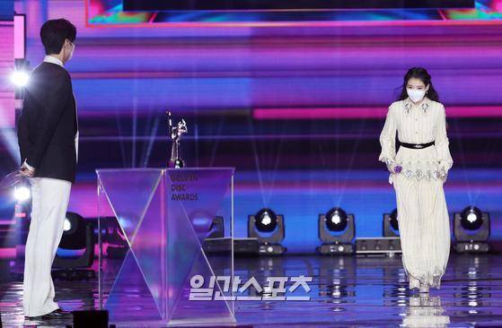 가수 아이유가 9일 오후 언택트로 열린 ’제35회 2021 골든디스크 어워즈 with 큐라프록스’ 디지털 음원 부문에서 영광의 대상에 오르며 시상자로 자신의 이름을 호명한 배우 이민호에 인사하며 무대로 등장하고 있다.
