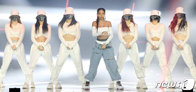 (서울=뉴스1) 김진환 기자 = 가수 제시가 9일 오후 경기도 고양시 일산 킨텍스에서 온택트로 진행된 '제35회 골든디스크 어워즈 with 큐라프록스' 디지털 음원 부문에서 베스트 솔로 아티스트상을 수상한 후 축하공연을 펼치고 있다. (골든디스크어워즈 사무국 제공) 2021.1.9/뉴스1