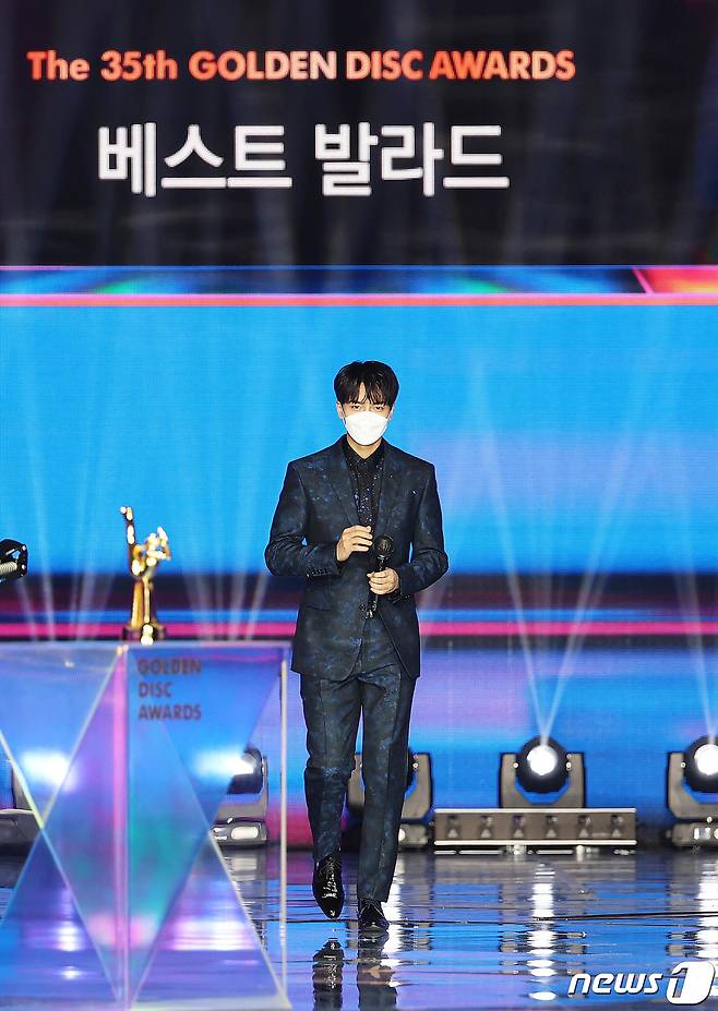 (서울=뉴스1) 김진환 기자 = 가수 이승기가 9일 오후 경기도 고양시 일산 킨텍스에서 온택트로 진행된 '제35회 골든디스크 어워즈 with 큐라프록스' 디지털 음원 부문에서 베스트 발라드 상을 수상 후 소감을 밝히고 있다. (골든디스크어워즈 사무국 제공) 2021.1.9/뉴스1