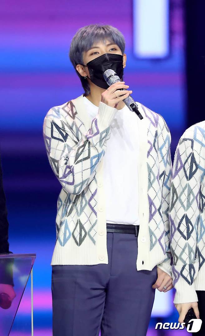 (서울=뉴스1) 김진환 기자 = 방탄소년단(BTS) RM이 9일 오후 경기도 고양시 일산 킨텍스에서 온택트로 진행된 '제35회 골든디스크 어워즈 with 큐라프록스' 디지털 음원 부문에서 본상을 수상한 후 소감을 밝히고 있다. (골든디스크어워즈 사무국 제공) 2021.1.9/뉴스1