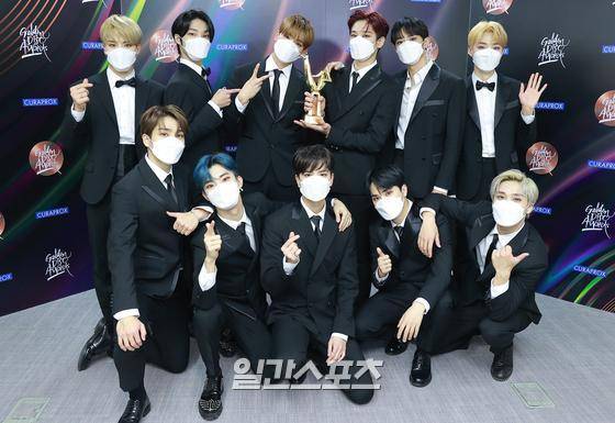 그룹 더보이즈가 9일 오후 언택트로 열린 ’제35회 2021 골든디스크 어워즈 with 큐라프록스’ 디지털 음원 부문에서 넥스트 제너레이션상을 수상하고 트로피 세리머니를 하고 있다.