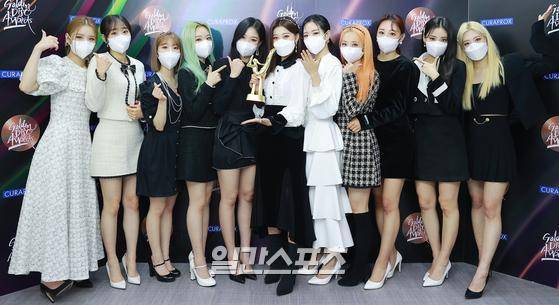 그룹 이달의 소녀가 9일 오후 언택트로 열린 ’제35회 2021 골든디스크 어워즈 with 큐라프록스’ 디지털 음원 부문에서 넥스트 제너레이션상을 수상하고 트로피 세리머니를 하고 있다.