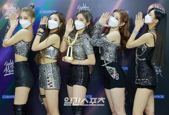 그룹 있지가 9일 오후 경기도 고양시 대화동 킨텍스에서 언택트로 열린 ’제35회 2021 골든디스크 어워즈 with 큐라프록스’ 디지털 음원 부문에서 본상을 수상하고 트로피 세리머니를 하고 있다.