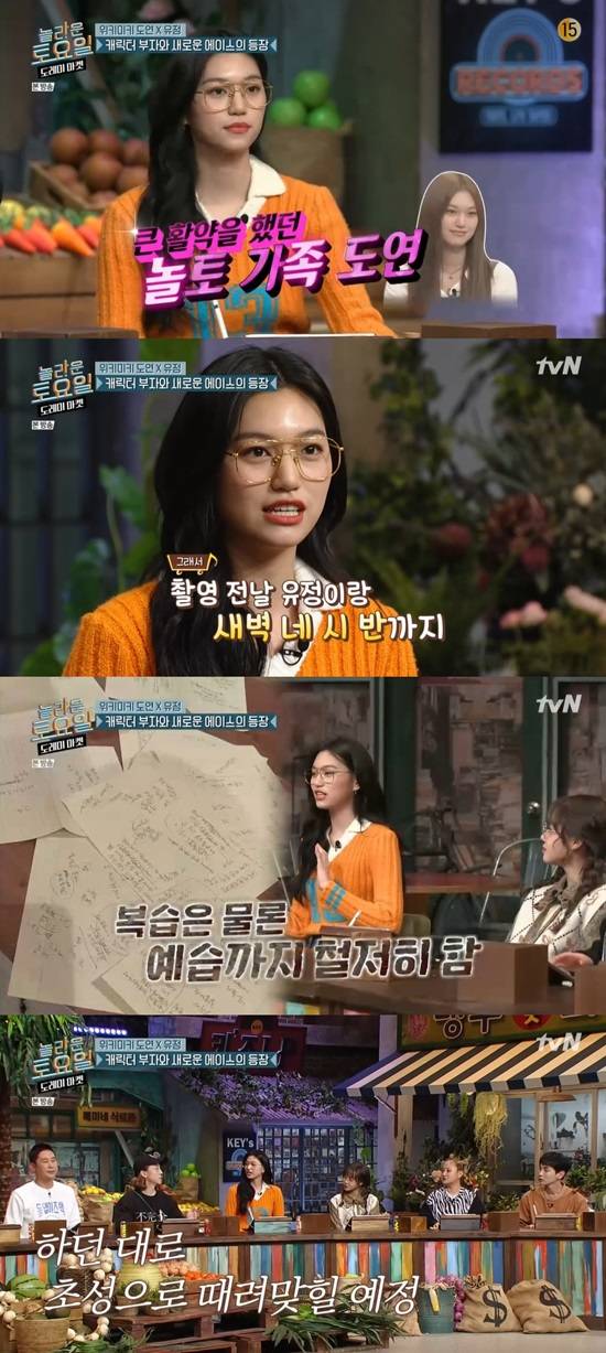 도연은 "받쓰 실력은 별로 좋지 않았다. 촬영 전날 유정이랑 새벽 네시 반까지 연습을 했다"고 밝혔다.