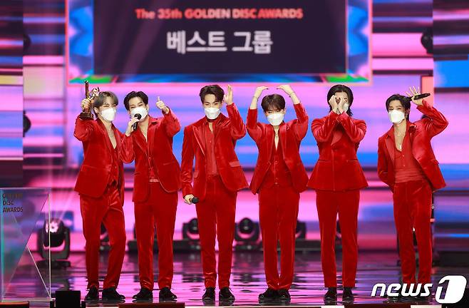 (서울=뉴스1) 김진환 기자 = 보이그룹 몬스타엑스가 9일 오후 경기도 고양시 일산 킨텍스에서 온택트로 진행된 '제35회 골든디스크 어워즈 with 큐라프록스' 디지털 음원 부문에서 베스트 그룹상을 수상한 후 소감을 밝히고 있다. (골든디스크어워즈 사무국 제공) 2021.1.9/뉴스1