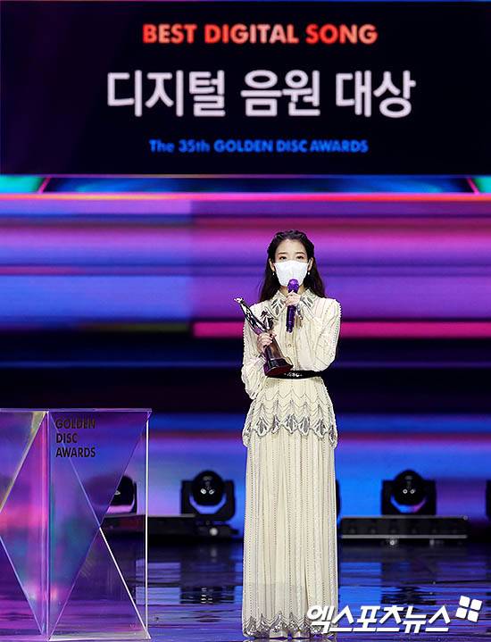 [엑스포츠뉴스 박지영 기자] 9일 오후 경기도 고양시 킨텍스에서 비대면 사전녹화로 진행된 '35회 골든디스크어워즈 with 큐라프록스' 음원 부문 시상식에 참석한 아이유가 대상 수상 소감을 밝히고 있다.