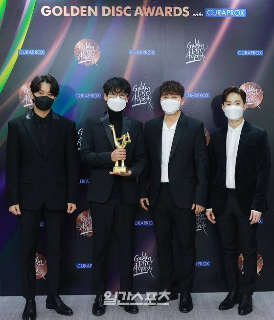 그룹 노을이 9일 오후 경기도 고양시 대화동 킨텍스에서 언택트로 열린 ’제35회 2021 골든디스크 어워즈 with 큐라프록스’ 디지털 음원 부문에서 본상을 수상하고 트로피 세리머니를 하고 있다.