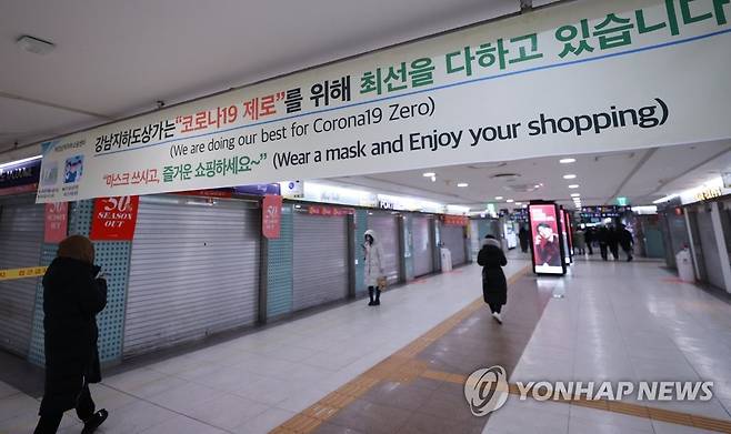 (서울=연합뉴스) 홍해인 기자 = 9일 오후 서울 강남역 지하도상가가 폐쇄돼 있다. 서울시와 서울시설공단은 강남지하도상가관리소 소속 환경미화원 1명이 이날 서초구보건소로부터 신종코로나바이러스감염증(코로나19) 확진 통보를 받으면서 강남역 지하도상가를 10일 밤 12시까지 폐쇄할 계획이다. 지하철 이용자 등의 불편을 최소화하기 위해 별도 이동 통로는 확보된 상태다. 2021.1.9