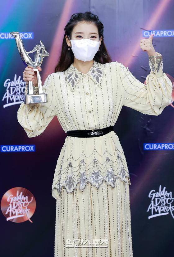 가수 아이유가 9일 오후 경기도 고양시 대화동 킨텍스에서 언택트로 열린 ’제35회 2021 골든디스크 어워즈 with 큐라프록스’ 디지털 음원 부문에서 대상을 수상하고 트로피 세리머니를 하고 있다.