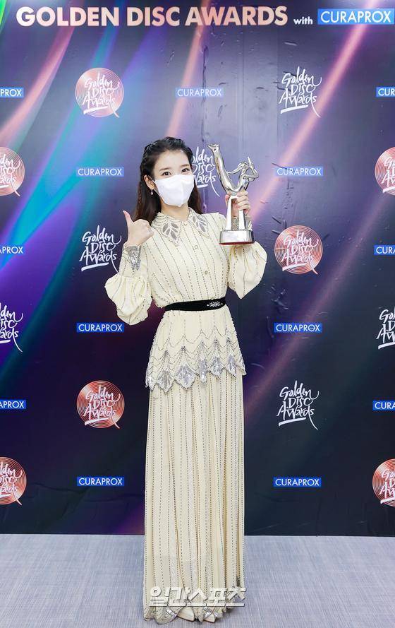 가수 아이유가 9일 오후 경기도 고양시 대화동 킨텍스에서 언택트로 열린 ’제35회 2021 골든디스크 어워즈 with 큐라프록스’ 디지털 음원 부문에서 대상을 수상하고 트로피 세리머니를 하고 있다.
