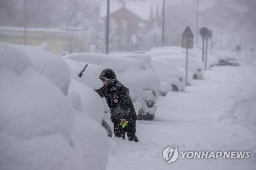 A man removes the snow from his car as the snow falls in Rivas Vaciamadrid, Spain, Saturday, Jan. 9, 2021. An unusual and persistent blizzard has blanketed large parts of Spain with snow, freezing traffic and leaving thousands trapped in cars or in train stations and airports that had suspended all services as the snow kept falling on Saturday. The capital, Madrid, and other parts of central Spain activated for the first time its red weather alert, its highest, and called in the military to rescue people from cars vehicles trapped in everything from small roads to the city's major thoroughfares. (AP Photo/Manu Fernandez)