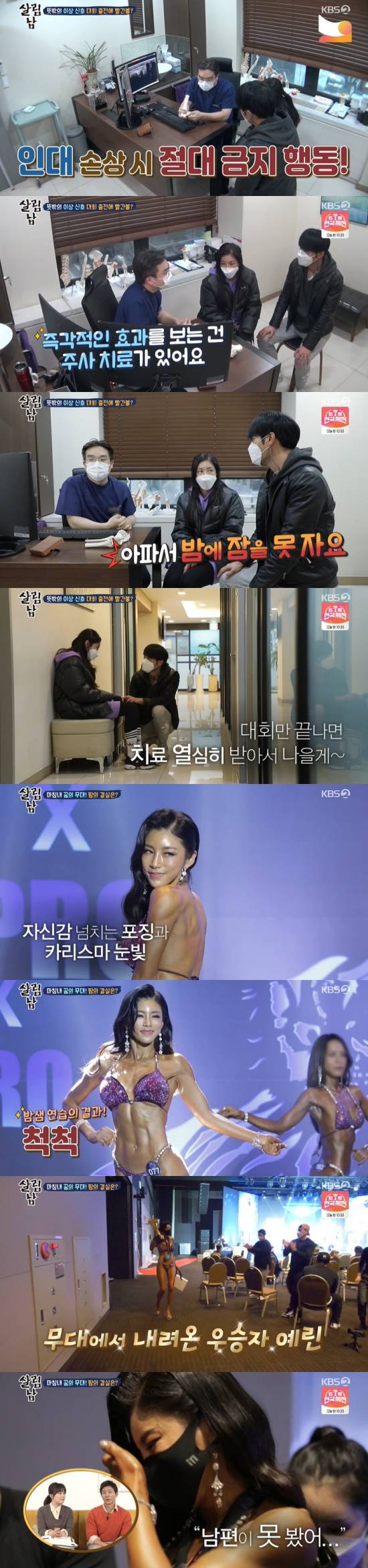의사는 "즉각적으로 통증을 가라앉히려면 주사 치료가 있다"라며 밝혔고, 김예린은 "대회가 며칠 안 남았다. 피트니스 대회에 나간다. 주사 같은 거 함부로 맞으면 안 된다"라며 거절했다.