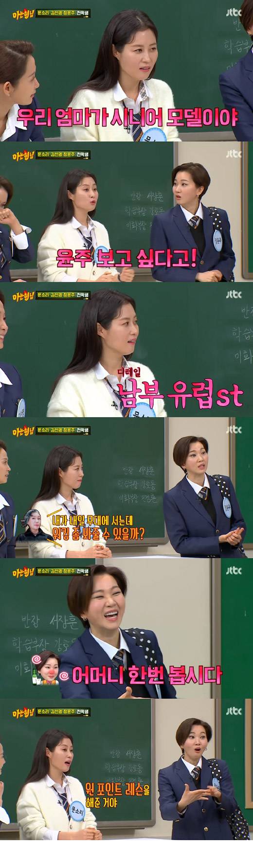 또 장윤주는 문소리의 엄마에게 직접 워킹 코치를 해줬다고 밝히며 "소리 언니 집에서 밥을 먹은 적이 있는데, 어머니가 내일 무대에 나간다고 워킹을 봐달라고 하셨다. 제가 그때 취해서 '어머니 한 번 봅시다'라고 한 거다. 그때 어머니 워킹을 직접 가르쳐드렸다"라고 전해 웃음을 안겼다.