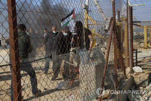 Palestinian demonstrators break a gate of the Israeli barrier during a protest against Israeli settlements in the outskirts of the village Kafr Thulth near the West Bank town of Qalqilya, Saturday, Jan. 9, 2021. (AP Photo/Majdi Mohammed)