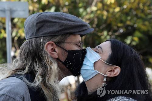 epa08928063 Anthi Spathi (R) and Kevin Loyd (L) kiss wearing face masks during their civil union in Nicosia, Cyprus, 09 January 2021, amid the coronavirus disease (COVID-19) pandemic. Cyprus enters a second lockdown on 10 January until 31 January against the spread of the coronavirus pandemic in the island. EPA/KATIA CHRISTODOULOU