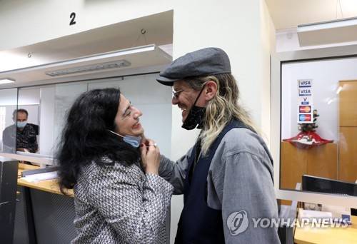 epa08928066 Anthi Spathi (L) and Kevin Loyd (R) react during their civil union in Nicosia, Cyprus, 09 January 2021, amid the coronavirus disease (COVID-19) pandemic. Cyprus enters a second lockdown on 10 January until 31 January against the spread of the coronavirus pandemic in the island. EPA/KATIA CHRISTODOULOU