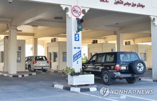 epa08928102 Car crossing the Qatari side of the Abu Samrah border into Saudi Arabia following the opening of crossings between the two countries, at Abu Samra, Qatar, 09 January 2021. Qatar and Saudi Arabia reopened their land border at Abu Samrah, Qatar. EPA/NOUSHAD THEKKAYIL