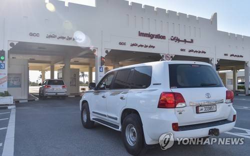 epa08928107 Car crossing the Qatari side of the Abu Samrah border into Saudi Arabia following the opening of crossings between the two countries, at Abu Samra, Qatar, 09 January 2021. Qatar and Saudi Arabia reopened their land border at Abu Samrah, Qatar. EPA/NOUSHAD THEKKAYIL