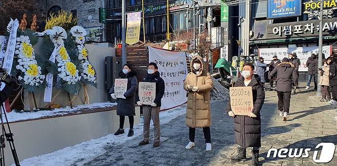 이들은 "신종 코로나바이러스 감염증(코로나19) 여파로 일대 상인들이 존폐의 기로에 서 있다"며 "방역과 함께 오후 9시 이후 운영 및 보상 정책을 정부가 내놓으라"고 촉구했다. (이태원 상인회 제공) 2021.1.9/뉴스1