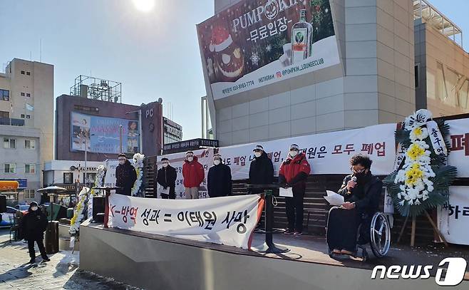 이날 이태원 관광특구협회와 이태원 상인회 등에 속한 자영업자들은 "신종 코로나바이러스 감염증(코로나19) 여파로 일대 상인들이 존폐의 기로에 서 있다"며 "방역과 함께 오후 9시 이후 운영 및 보상 정책을 정부가 내놓으라"고 촉구했다. (이태원 상인회 제공) 2021.1.9/뉴스1