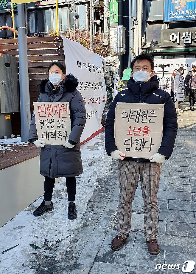 (서울=뉴스1) 박지혜 기자 = 이태원 관광특구협회와 이태원 상인회 등에 속한 자영업자들이 9일 서울 용산구 이태원역 인근 세계음식거리에서 정부를 향해 방역수칙 재검토를 호소하고 있다.