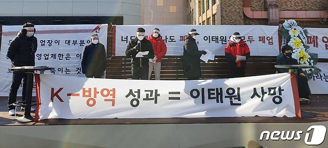 (서울=뉴스1)은 "신종 코로나바이러스 감염증(코로나19) 여파로 일대 상인들이 존폐의 기로에 서 있다"며 "방역과 함께 오후 9시 이후 운영 및 보상 정책을 정부가 내놓으라"고 촉구했다. (이태원 상인회 제공) 2021.1.9/뉴스1 박지혜 기자 = 이태원 관광특구협회와 이태원 상인회 등에 속한 자영업자들이 9일 서울 용산구 이태원역 인근 세계음식거리에서 정부를 향해 방역수칙 재검토를 호소하고 있다.
