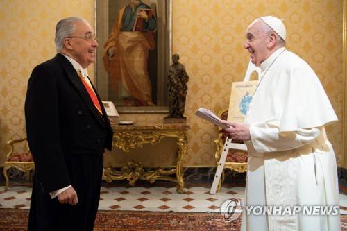 epa08928142 A handout picture provided by the Vatican Media shows Pope Francis (R) receiving Uruguay's Ambassador Guzman Miguel Carriquiry Lecour (L) during an audience at the Vatican, 09 January 2021. EPA/VATICAN MEDIA HANDOUT HANDOUT EDITORIAL USE ONLY/NO SALES