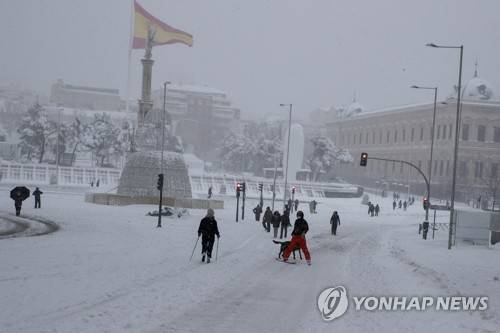 A man skies in Colon square in front of the statue of Christopher Columbus and a large Spanish flag during a heavy snowfall in central Madrid, Spain, Saturday, Jan. 9, 2021, prompting a red weather alert with military assistance to rescue people trapped in cars. An unusual and persistent blizzard has blanketed large parts of Spain with snow, freezing traffic and leaving thousands trapped in cars or in train stations and airports that had suspended all services as the snow kept falling on Saturday.(AP Photo/Paul White)