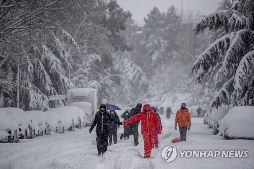 People walk during a heavy snowfall in Rivas Vaciamadrid, Spain, Saturday, Jan. 9, 2021. An unusual and persistent blizzard has blanketed large parts of Spain with snow, freezing traffic and leaving thousands trapped in cars or in train stations and airports that had suspended all services as the snow kept falling on Saturday. The capital, Madrid, and other parts of central Spain activated for the first time its red weather alert, its highest, and called in the military to rescue people from cars vehicles trapped in everything from small roads to the city's major thoroughfares. (AP Photo/Manu Fernandez)